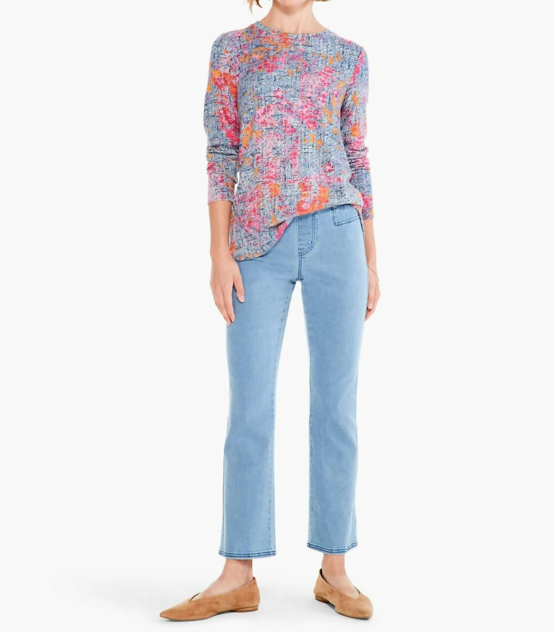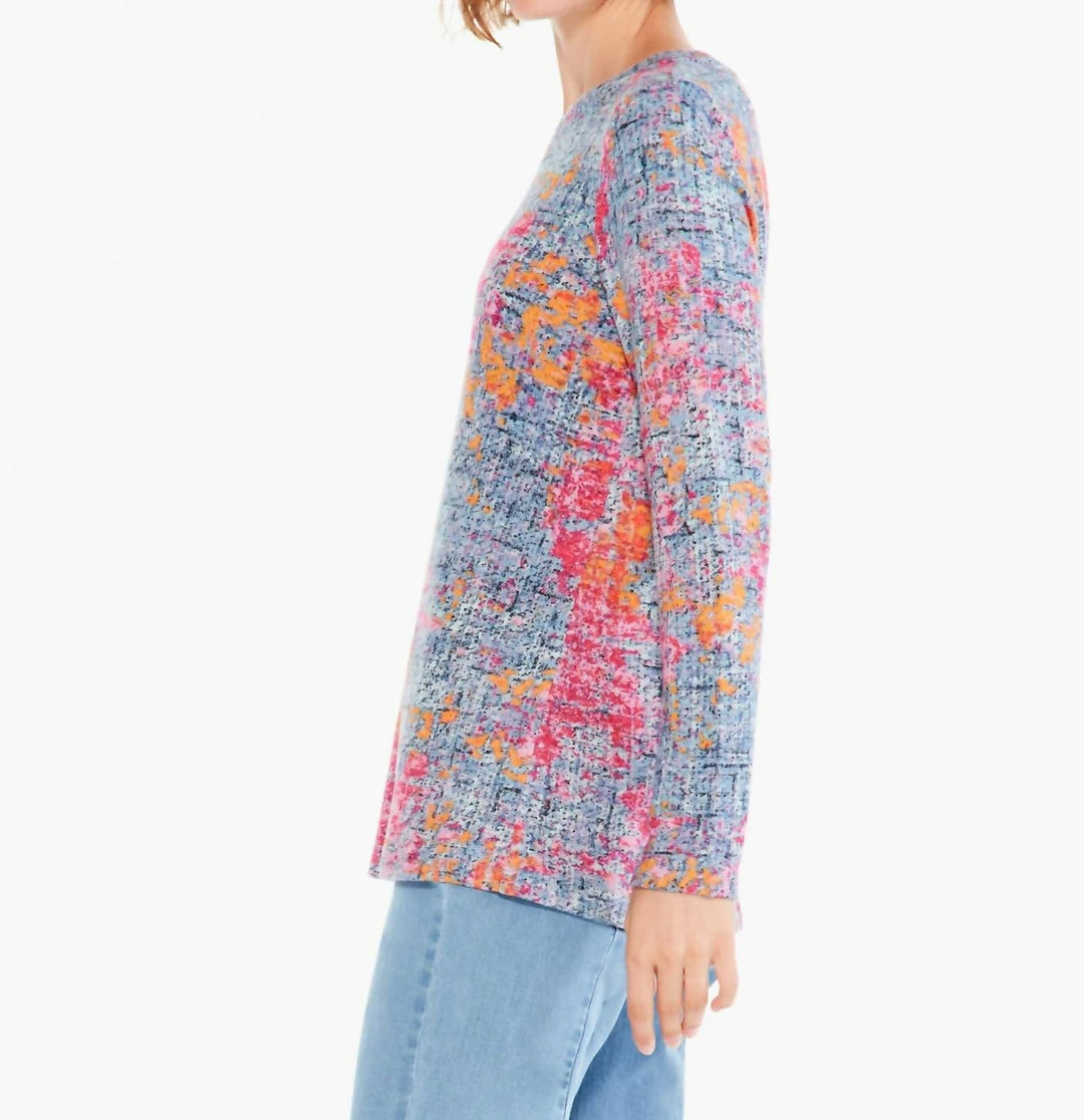 You’re glowing! A super drapey, super colorful unique novelty top – perfect for matching with just about any solid color whether you’ve got big plans or are looking to add a splash of color to your everyday routine. An easy knit long-sleeved pullover shape that sits at the hip. We love the textured appearance and the random interplay of the colors.