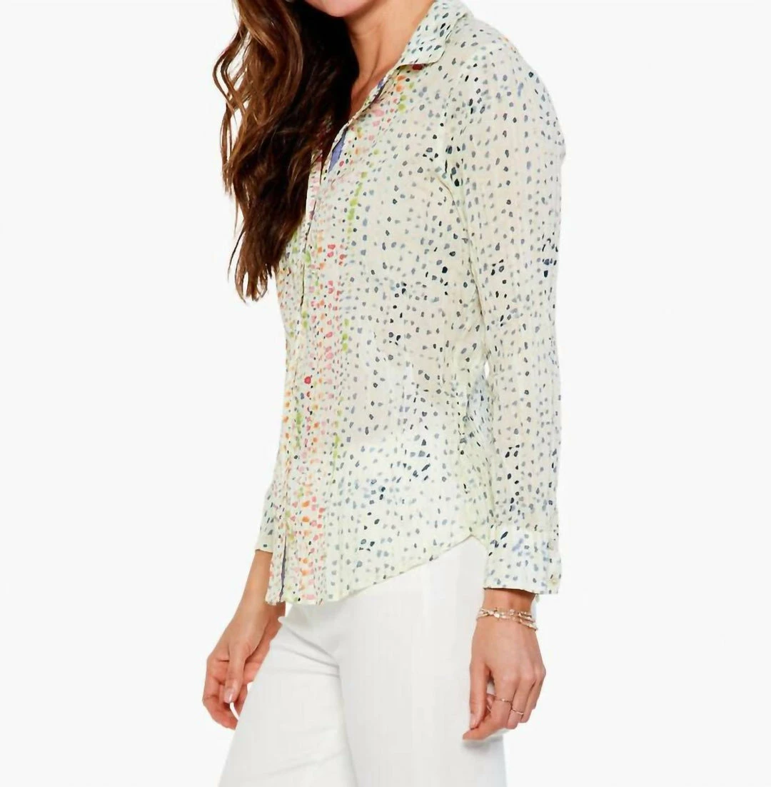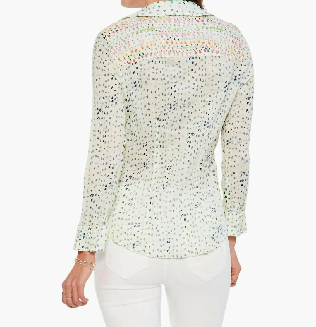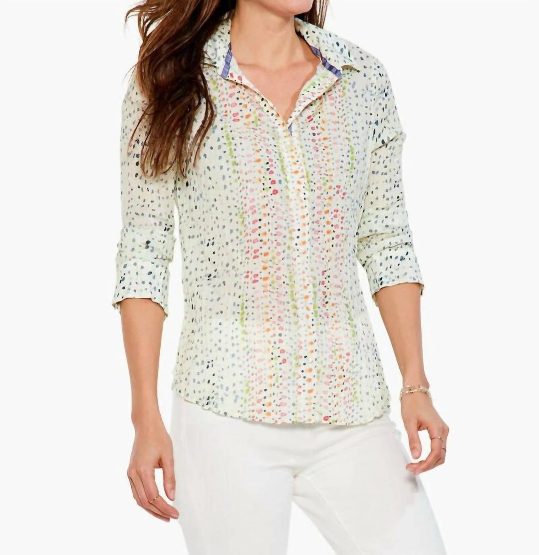 The Dotty Crinkle Top features a whimsical, colorful new print that adds playful positivity to your spring season. The silhouette is easy yet polished with a shirt collar, button front, and long sleeves. We made it with our newest fabric — our “crinkle cotton”. It’s made with lightweight, sustainably sourced cotton and designed with a cool, intentionally crinkled look. This easy fabric takes color (and print!) beautifully — delivering a bold, artistic look for every print, pattern, and hue.Material and CareMachine wash cold with like colors. Do not bleach. To keep crinkled, twist while damp and allow to dry. Do not iron.100% Cotton; exclusive of decorationSIZE CHARTMISSYSIZE BUST WAIST HIP XS 0 32.5 24.5 34.5 2 33.5 25.5 35.5 S 4 34.5 26.5 36.5 6 35.5 27.5 37.5 M 8 36.5 29 39 10 37.5 30 40 L 12 39 31.5 41.5 14 40.5 33 43 XL 16 42 34.5 44.5 18 43.5 36 46 XXL – 45 37.5 47.5