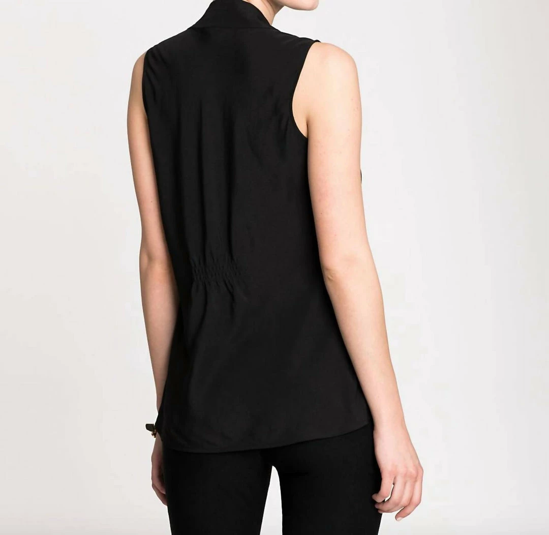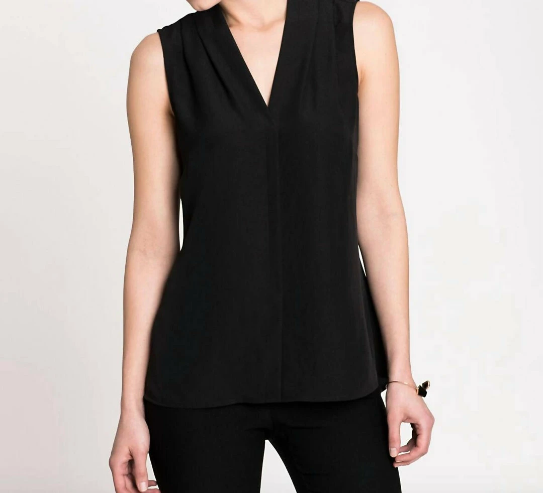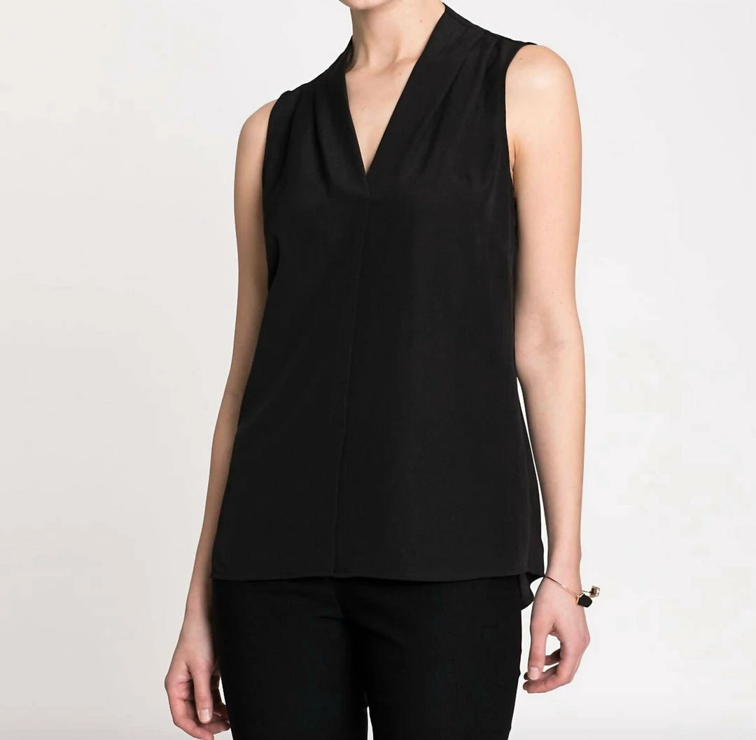 DetailsWoven topSleeveless, bra friendlyBack ruching for a flattering fitV-necklineFaux front placketPerfect for layering27″ longFoundation styleMachine wash cold. Only non-chlorine bleach when needed. Reshape and lay flat to dry. Cool iron on inside only if needed. For best result, Dry Clean.