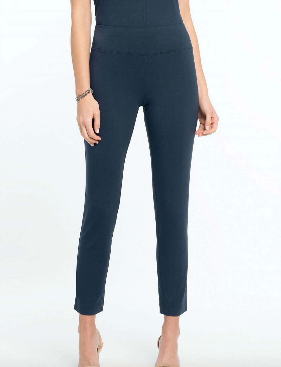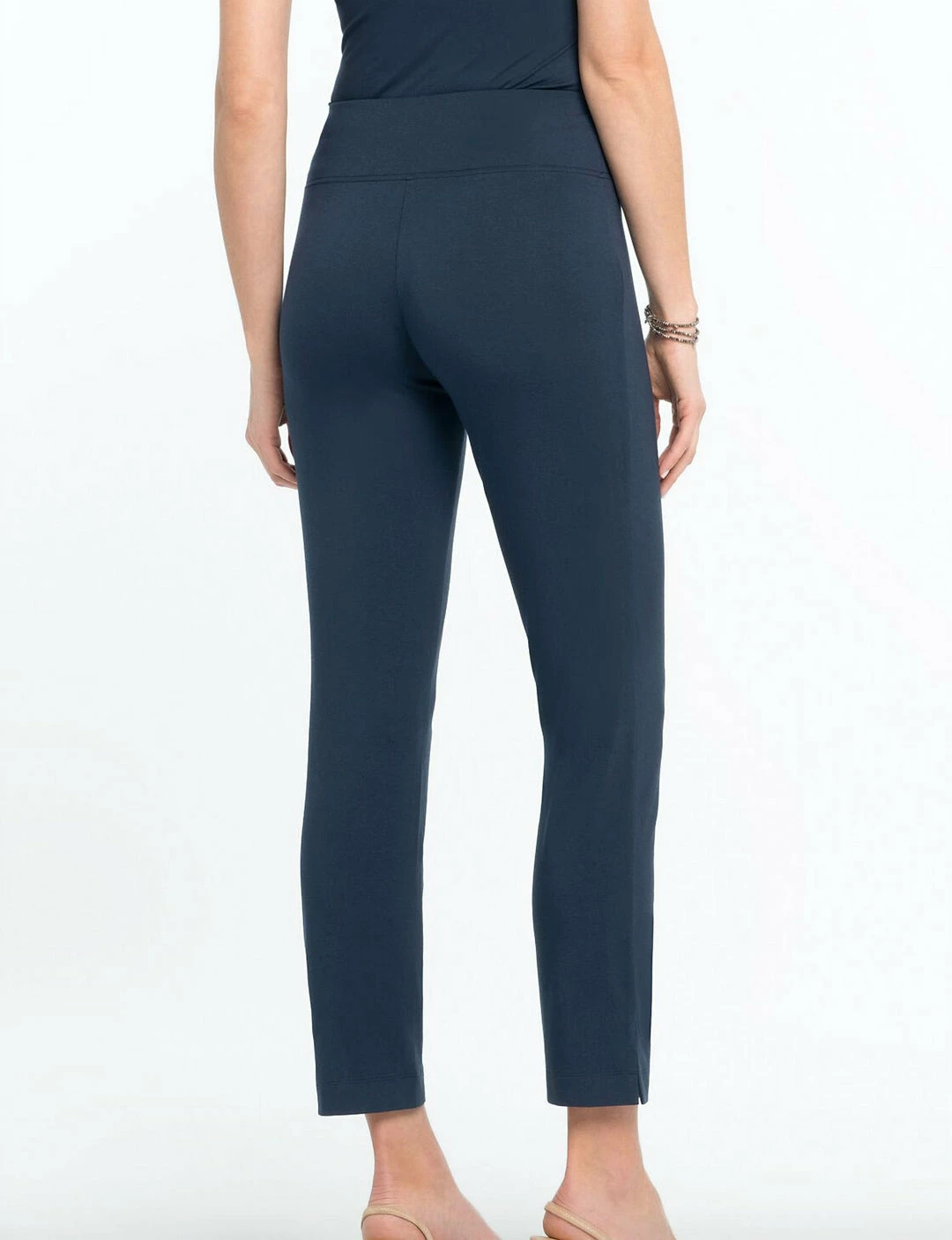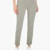 FeaturesKnit pantEaze fabricSits at waistPull onSlimAnkle lengthInseams – 28″Leg Opening – 13 1/2″Turn garment inside out. Machine wash cold with similar colors. Gentle Cycle. Do not bleach. Tumble dry low. Remove promptly. Cool iron on inside if needed.96% Rayon / 4% Spandex