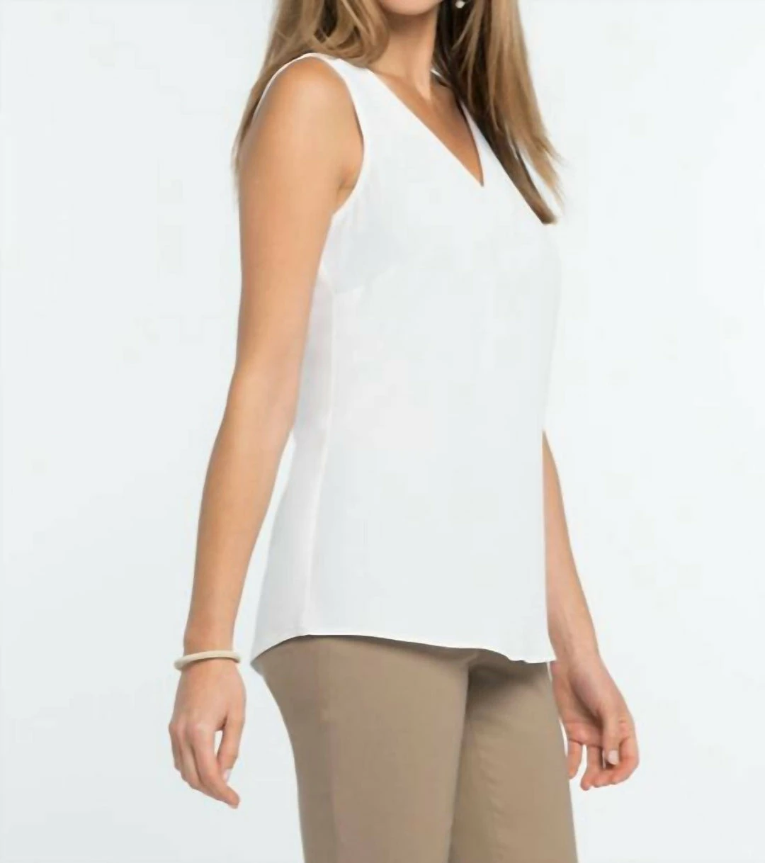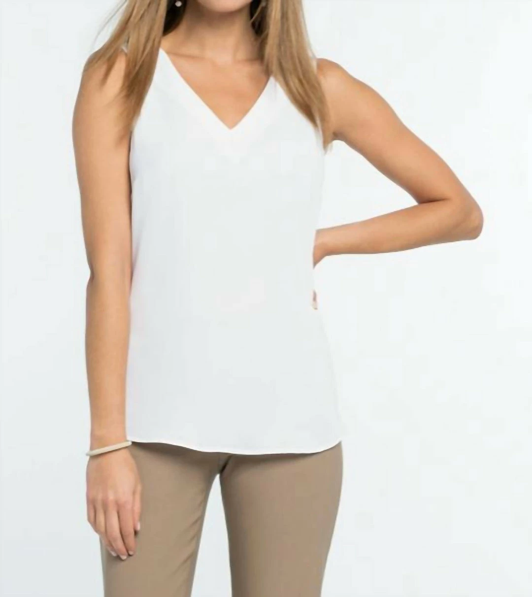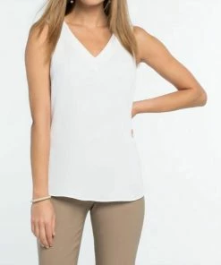 DetailsWoven tankMatte SatinStitched line detail at necklineEase fabric back panelV-neckSleevelessSits slightly below hipMissy – 27″ front, 25 3/4″ backMaterial and CareMachine wash cold. Gentle cycle. Only non-chlorine bleach when needed. Reshape and lay flat to dry. Cool iron on inside if needed. For best result, dry clean.