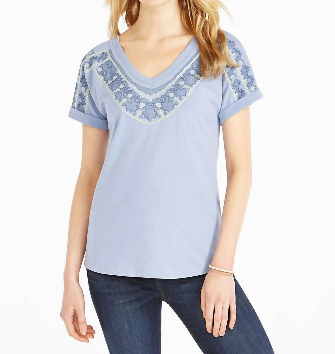 FeaturesKnit pulloverPerfect KnitEmbroidery detail on yokeV-neckShort sleeveSits at hipTurn garment inside out. Machine wash cold with similar colors. Gentle cycle. Only non-chlorine bleach when needed. Reshape and lay flat to dry. Cool iron on inside if needed.95% Cotton/5% Spandex; Exclusive of Decoration