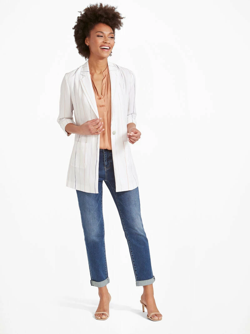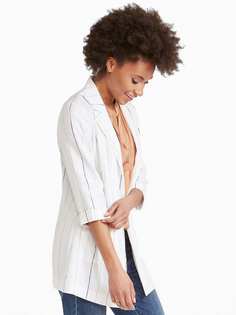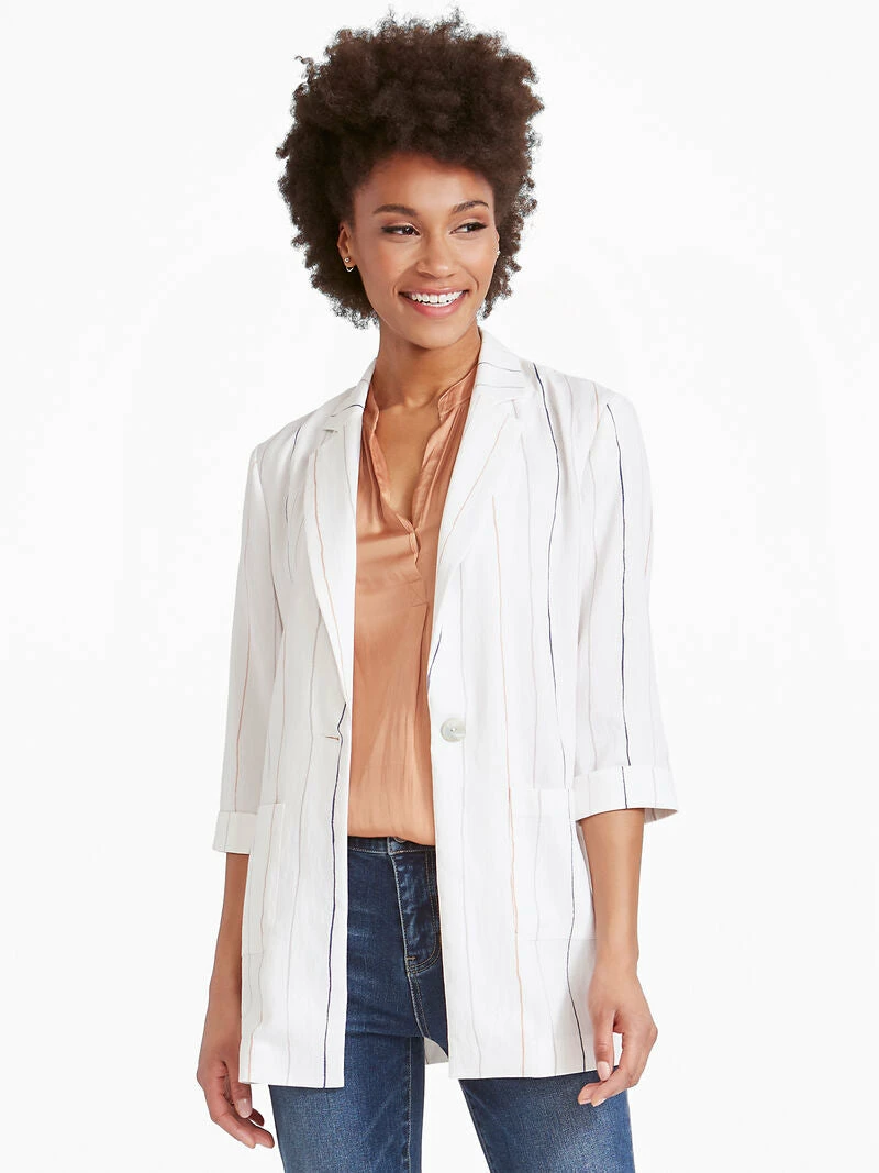 We have a thing for stripes this season. This comfortable, easy jacket feels lightweight and effortless. The single button closure, peak lapels, and 3/4 sleeve are all nods to classic menswear. But we’ve made our version ultra-feminine and ultra-elegant with colorful stripes and an expertly crafted silhouette. We love layering this with all-black for a sophisticated statement.