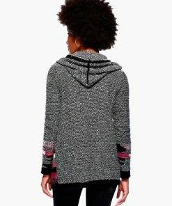 FeaturesCardigan sweaterNovelty stitch on front panelsMidweightRelaxed FitRound neckHoodedLong sleeveBasic SleeveOpen frontSits slightly below hipHand wash cold separately. Do not bleach. Do not twist or wring. Reshape and lay flat to dry. Cool iron if necessary.58% Cotton/33% Acrylic/7% Nylon/2% Spandex