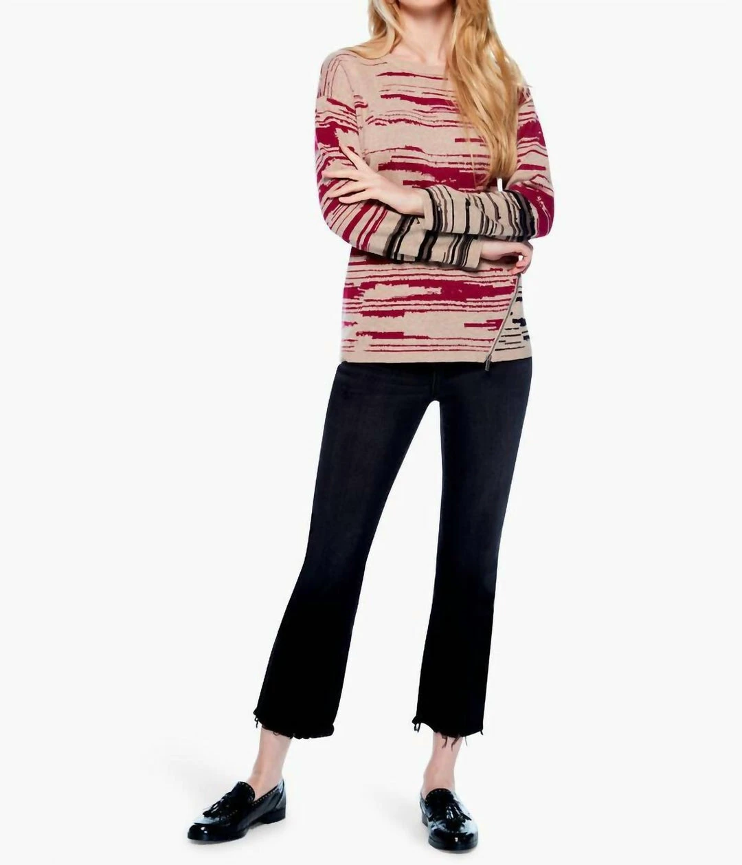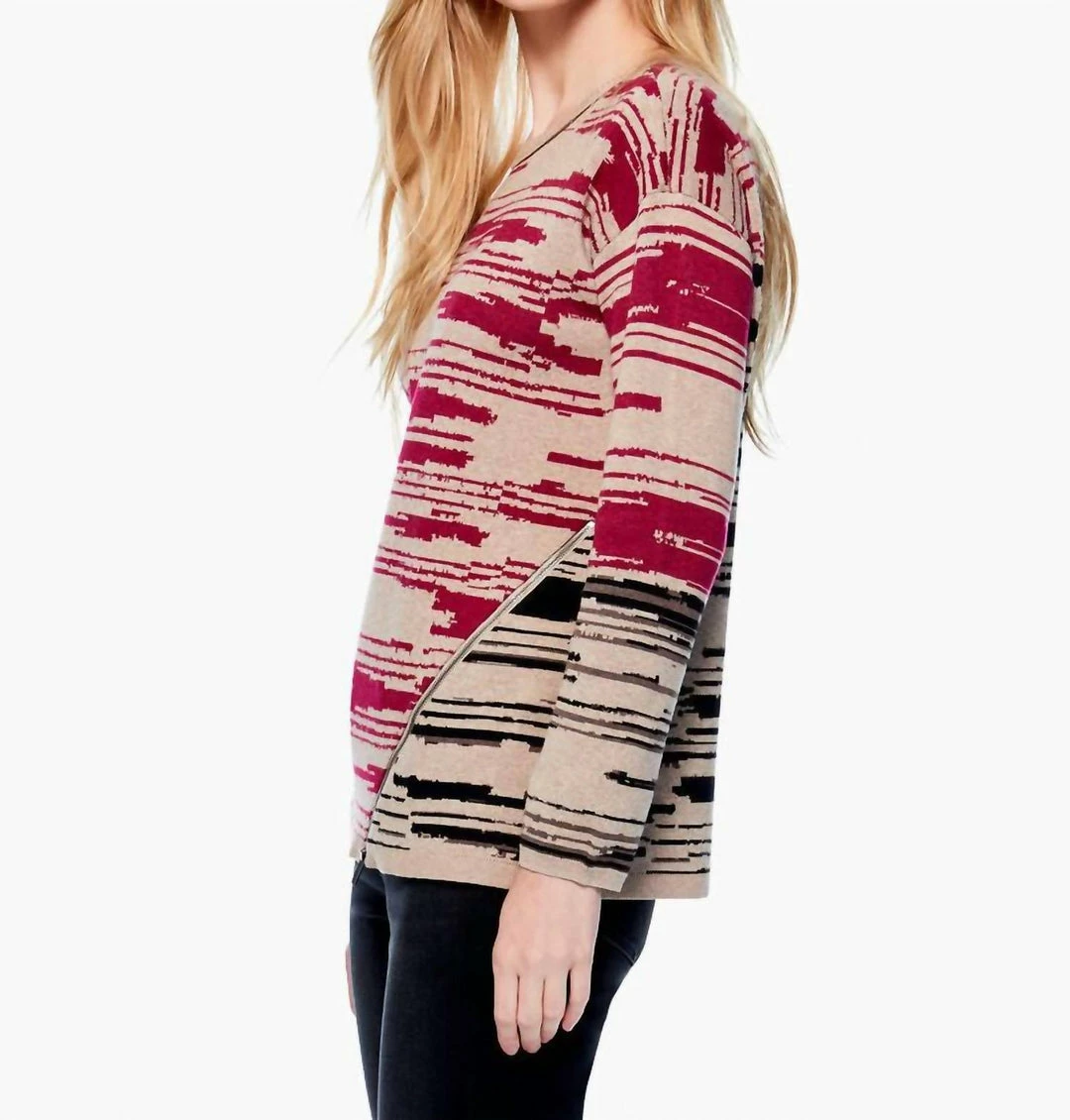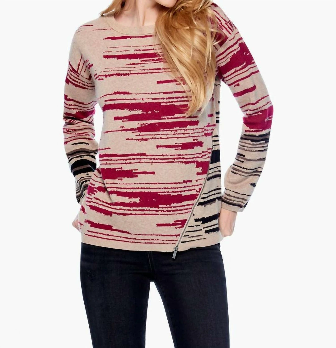 This versatile, pullover sweater features one-of-a-kind NIC+ZOE artwork with a mix of easy colors and playful artistry. We gave this a cool zipper detail on the left side and kept the fit easy and relaxed for added comfort. It features a round neck, long sleeves, and a drop shoulder.Mindfully Made – Fully fashioned knitwear (or “no waste knitwear”) is knit to shape, then each panel is linked together; meaning less textile waste.Pullover sweaterIntarsia, zipper detail on wearer’s left sideOriginal artworkMidweightRelaxed FitRound neckLong sleeveDropped shoulderSits at hipMissy – 25″ longHand wash cold separately. Do not bleach. Do not twist or wring. Reshape and lay flat to dry. Cool iron if necessary.55% Cotton/25% Polyester/20% Viscose